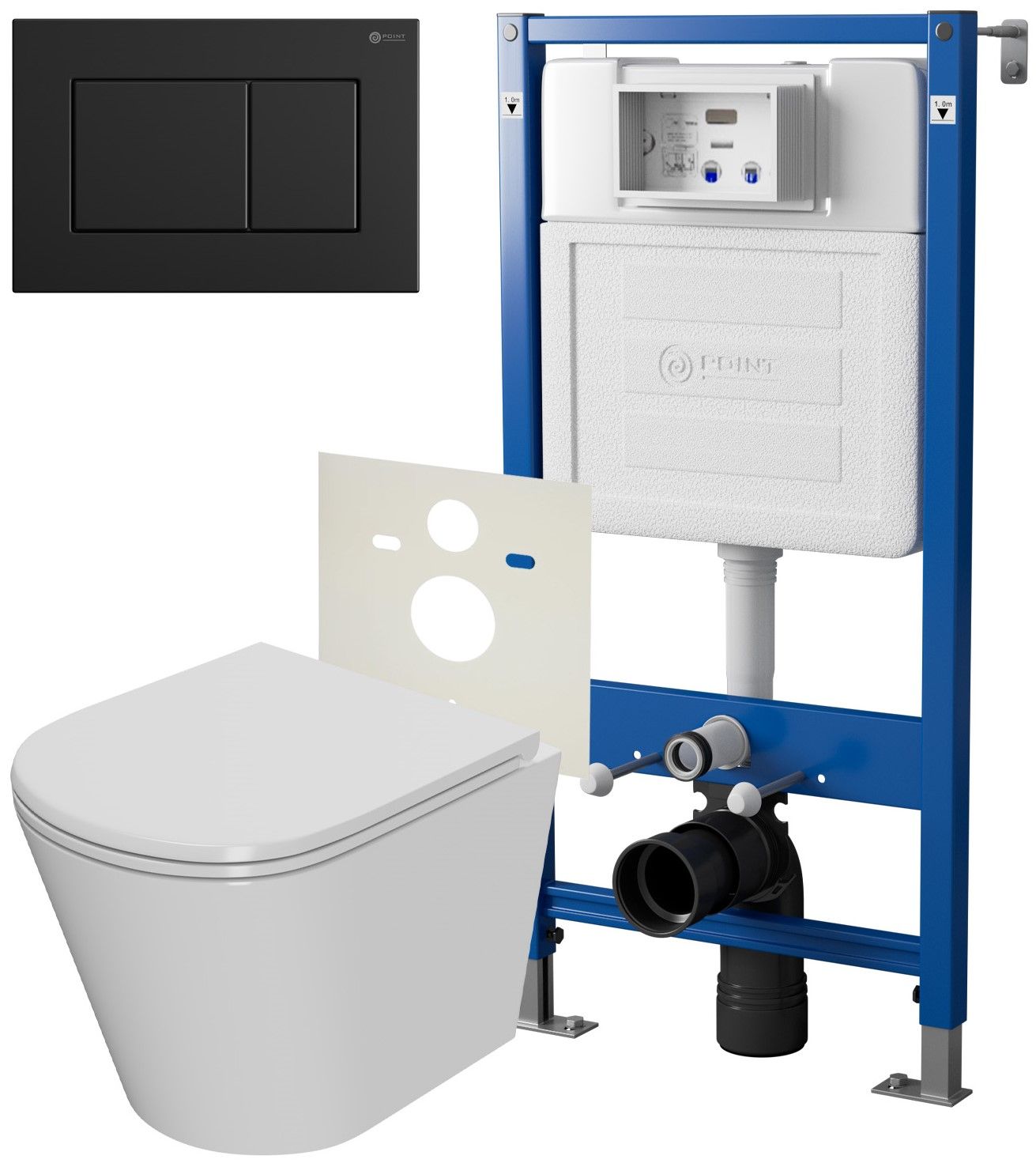 Сет: Система инсталляции Point Элемент для подвесного унитаза PN45120 + Клавиша смыва для инсталляции Point Ника, черная матовая, PN44081BM + Унитаз подвесной Point Виктория безободковый, сиденье микролифт PN41061
