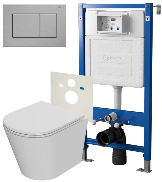 Сет: Система инсталляции Point Элемент для подвесного унитаза PN45120 + Клавиша смыва для инсталляции Point Ника, нержавеющая сталь, сталь брашированная, PN44081SB + Унитаз подвесной Point Виктория безободковый, сиденье микролифт PN41061