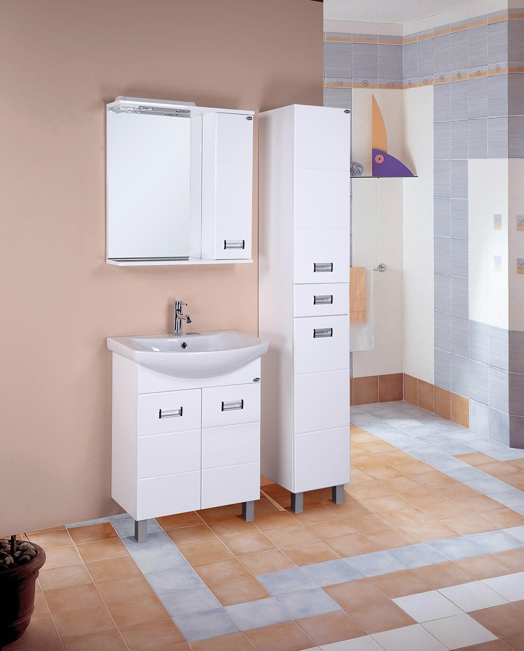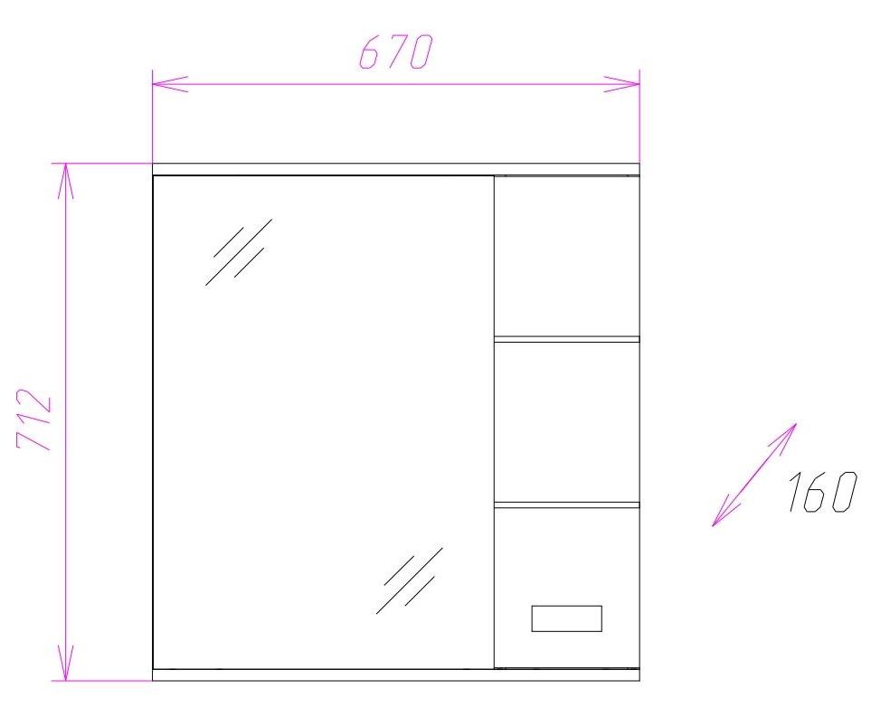 Справа от зеркала за распашной дверцей с механизмом плавного закрывания расположено отделение для хранения, разделенное на две части горизонтальной полочкой, под зеркалом - открытая полочка для косметических средств или декоративных элементов.