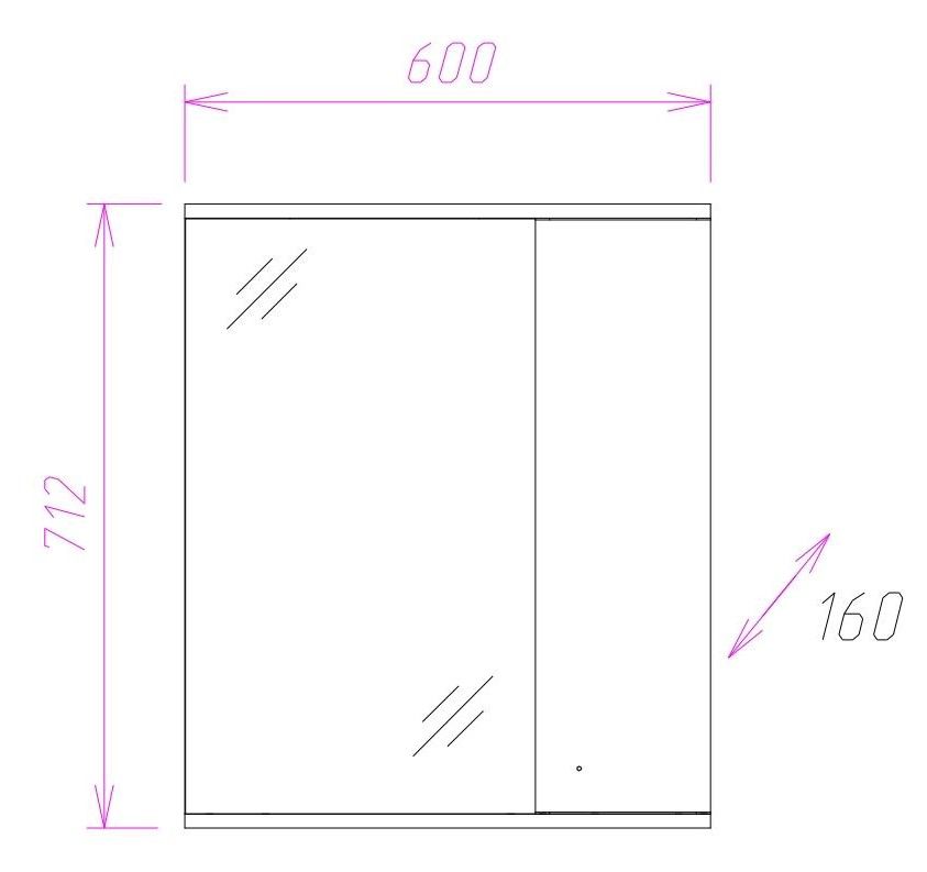 Справа от зеркала за распашной дверцей с механизмом плавного закрывания расположено отделение для хранения, разделенное на две части горизонтальной полочкой, под зеркалом - открытая полочка для косметических средств или декоративных элементов.