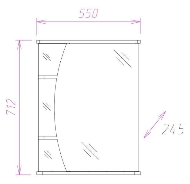 Слева за распашной зеркальной дверцей с механизмом плавного закрывания расположено вместительное отделение для хранения, разделенное на 3 части горизонтальными полочками, справа - 3 открытые полочки для косметических средств или декоративных элементов.
