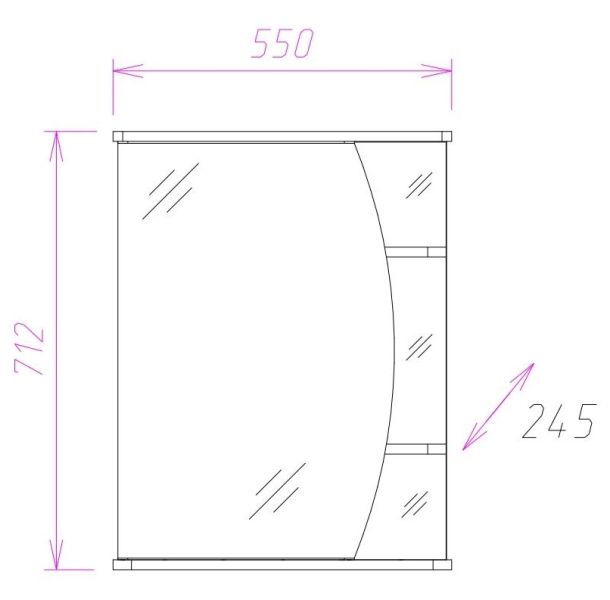 Справа за распашной зеркальной дверцей с механизмом плавного закрывания расположено вместительное отделение для хранения, разделенное на 3 части горизонтальными полочками, справа - 3 открытые полочки для косметических средств или декоративных элементов.