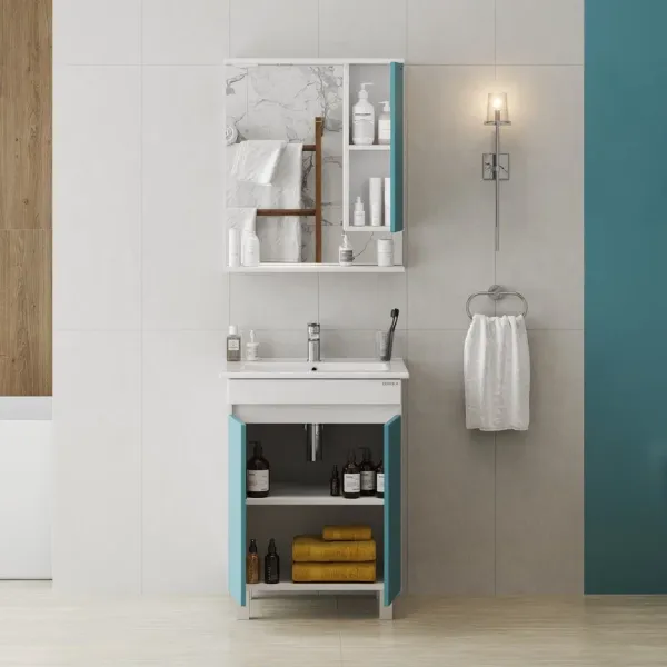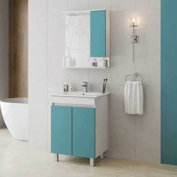 Навесной зеркальный шкаф Марви 60 нежного бирюзового цвета добавит интерьеру яркие краски и придаст ванной комнате ощущение свежести, чистоты и уюта.