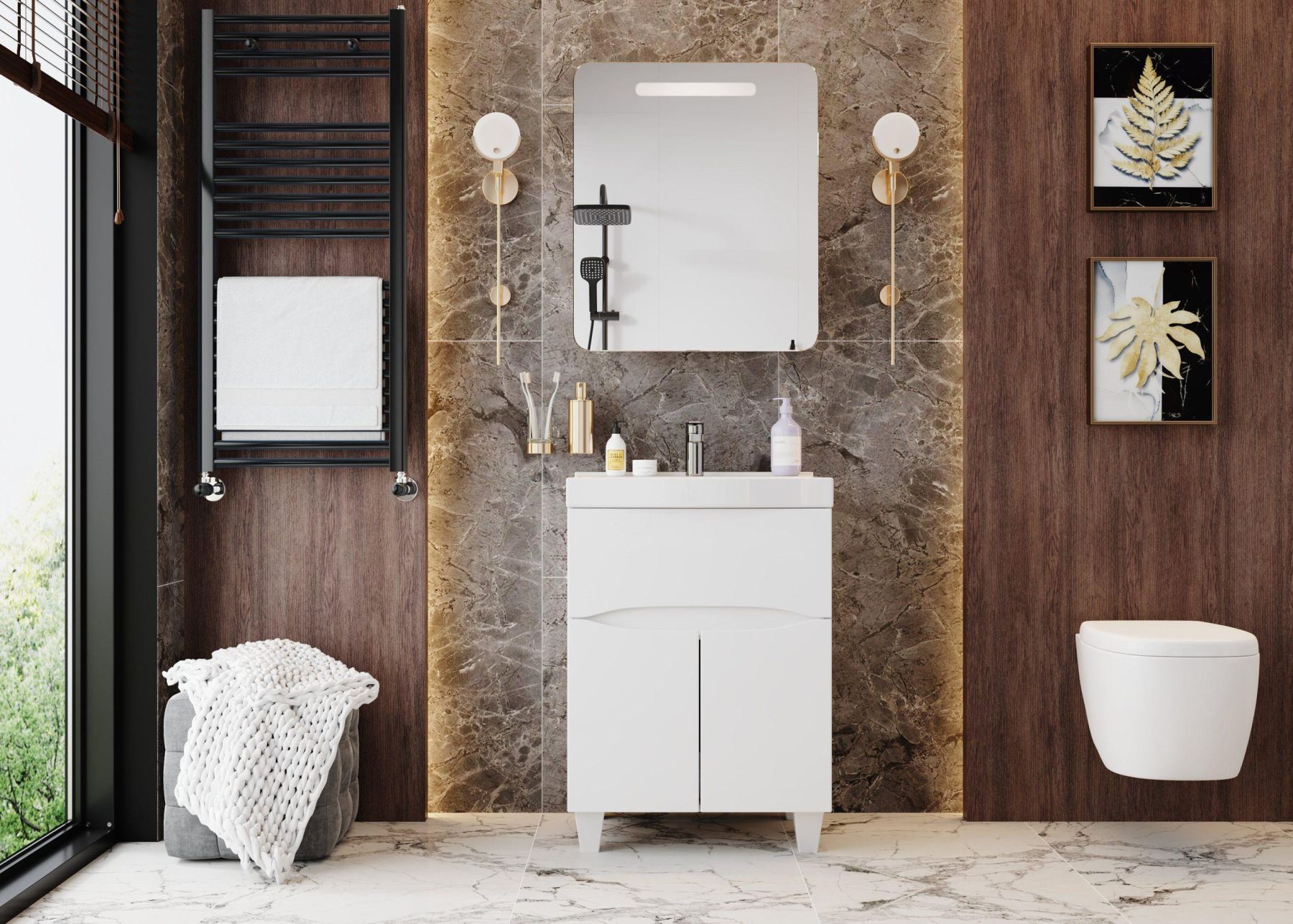 Дверца с механизмом плавного закрывания - она же зеркальный фасад со скошенными углами и светодиодной подсветкой, скрывает вместительное пространство для хранения, разделенное стеклянной полочкой с еврокромкой.