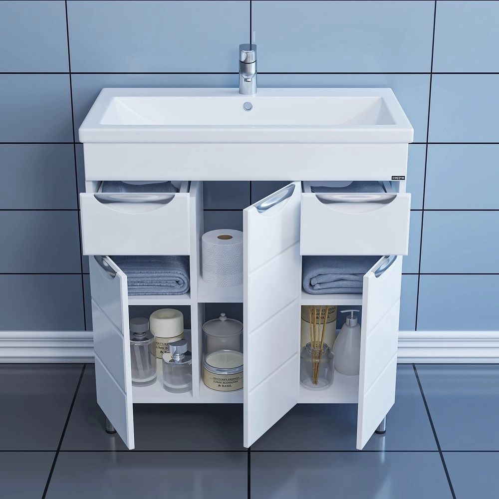 Слева от зеркала за распашной дверцей с механизмом плавного закрывания расположено отделение для хранения, под зеркалом - открытая полочка для косметических средств или декоративных элементов.