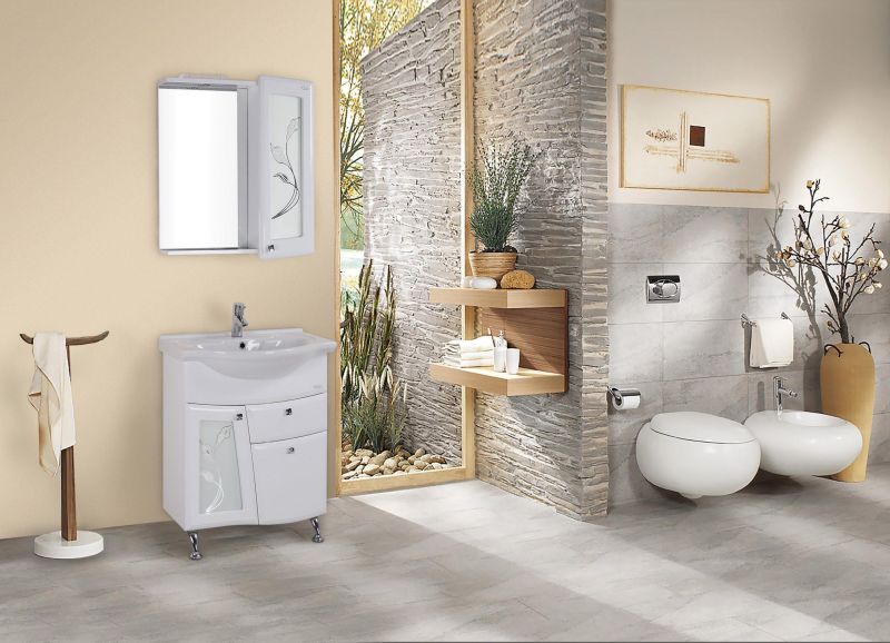 Справа от зеркала за распашной дверцей с механизмом плавного закрывания расположено отделение для хранения, разделенное на две части стеклянной полочкой с еврокромкой, под зеркалом - открытая полочка для косметических средств или декоративных элементов.