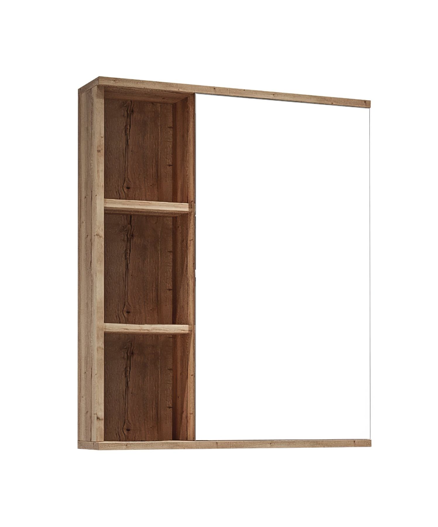 Слева за распашной дверцей с механизмом плавного закрывания расположено отделение для хранения, разделенное на две части горизонтальной полочкой, справа и под зеркалом - открытые полочки для косметических средств или декоративных элементов.