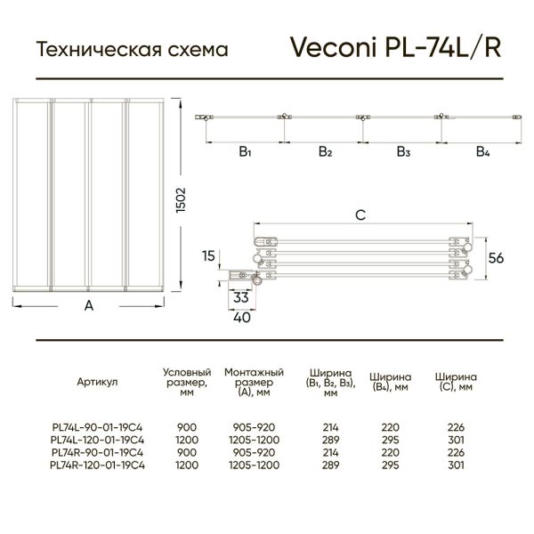 Шторка на ванну Veconi Palau PL-74L, 1200x1500, хром, стекло прозрачное
