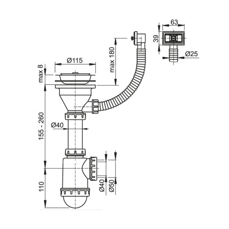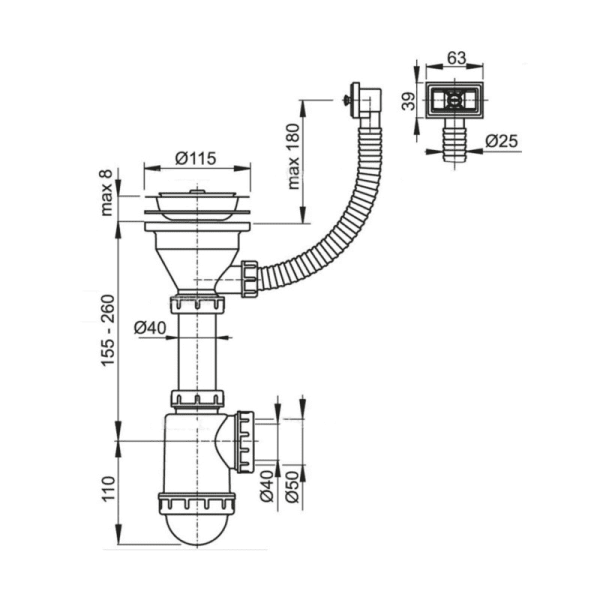 Сифон для мойки AlcaPlast с нержавеющей решеткой ?115 и гофропереливом без штуцера A447-DN50/40