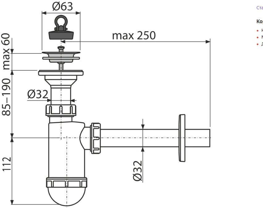 Сифон для раковины AlcaPlast ?32 с нержавеющей решеткой ?63 без штуцера A410 купить