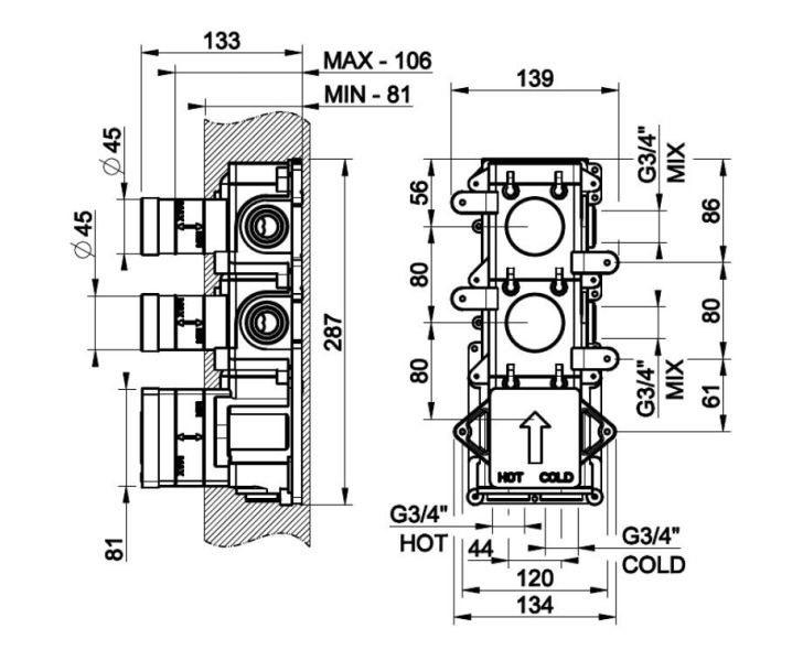 Скрытая часть Gessi для встраиваемого термостатического смесителя с 2 независимыми выходами - э... Подробнее