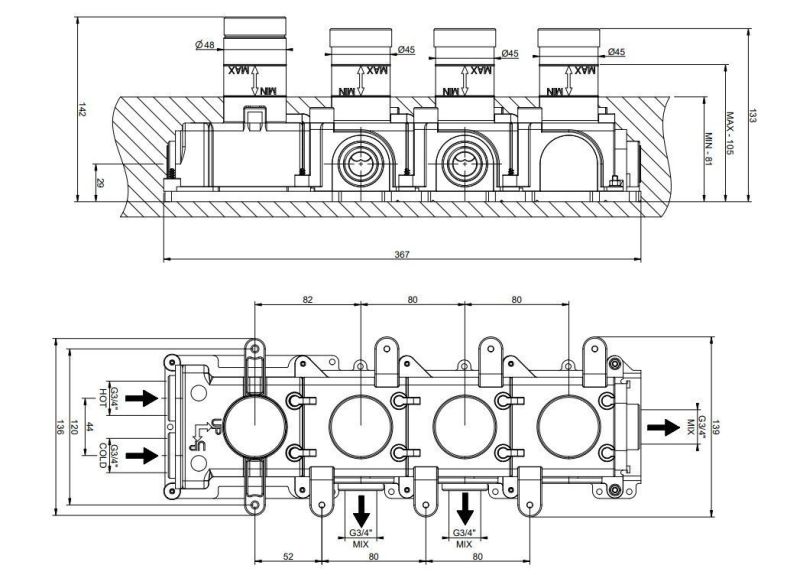 Использование трех независимых выходов позволяет создавать индивидуальные комбинации для душа и ванны, что делает процесс купания более комфортным и разнообразным. Системы с термостатом гарантируют, что температура воды останется постоянной, предотвращая неприятные перепады. Скромный и лаконичный дизайн скрытой части позволяет сохранить минималистичный стиль интерьера.