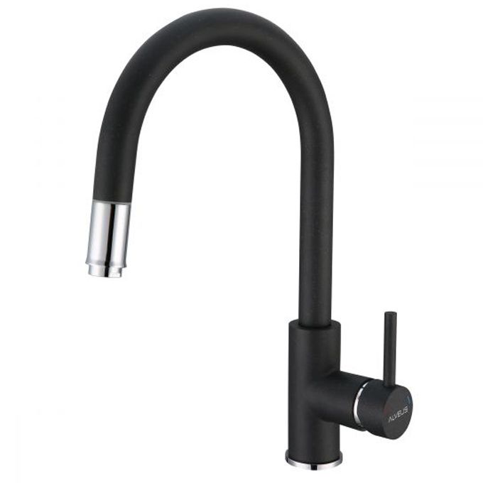 Смеситель для кухни Alveus Delos 1129022 черныйВысококачественный смеситель для кухни от Alveus - ведущего производителя оборудования для кухни в Восточной Европе. Опыт производства техники для кухни с 1954 года. Высокий поворотный излив смесителя помогает облегчает мытье посуды. Выдвижной излив позволяет не только помыть посуду, фрукты или наполнить кастрюлю водой, но и облегчает уход за кухонной мойкой, позволяет наполнять водой крупные емкости, которые не помещаются в мойку. Высокопрочное гальваническое хромированное покрытие подойдет к любому дизайну. Натуральные оттенки смесителя из палитры GRANITAL позволяют идеально сочетать кухонную мойку и смеситель. Долговечный керамический картридж с пониженным уровнем шума. Высокотехнологичный блок аэратора.