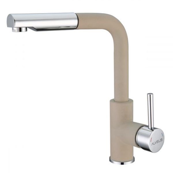 Смеситель для кухни Alveus Siros 1129045 бежевыйВысококачественный смеситель для кухни от Alveus - ведущего производителя оборудования для кухни в Восточной Европе. Опыт производства техники для кухни с 1954 года. Высокий поворотный излив смесителя помогает облегчает мытье посуды. Выдвижной излив позволяет не только помыть посуду, фрукты или наполнить кастрюлю водой, но и облегчает уход за кухонной мойкой, позволяет наполнять водой крупные емкости, которые не помещаются в мойку. Высокопрочное гальваническое хромированное покрытие подойдет к любому дизайну. Натуральные оттенки смесителя из палитры GRANITAL позволяют идеально сочетать кухонную мойку и смеситель. Долговечный керамический картридж с пониженным уровнем шума. Высокотехнологичный блок аэратора.