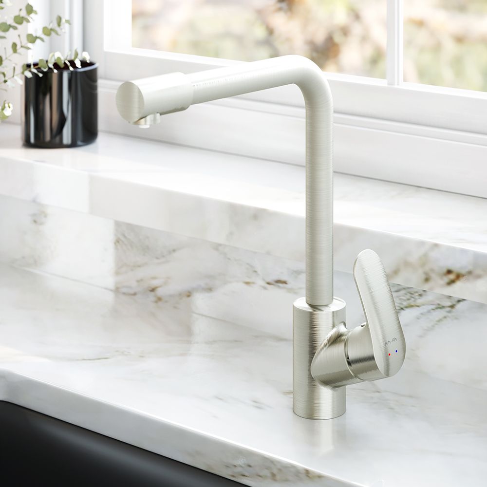Долгожданное пополнение в линейке кухонных смесителей Like – смеситель для кухни со встроенным каналом для питьевой воды. L-образная архитектура излива позволит разместить смеситель на мойке любого размера и даже под низкими шкафчиками при полном сохранении функционала и комфорта в использовании.Смеситель оснащен встроенным каналом для питьевой воды. Благодаря прогрессивной технологии Fresh Boost при вращении ручки на 90 градусов вы можете наслаждаться чистой питьевой водой. Для получения обычной воды, просто управляйте смесителем привычным способом.Эксклюзивная разработка для АМ.РМ: специально спроектированный керамический картридж SoftMotion 35 мм обеспечивает низкий уровень шума, выдерживает любые перепады давления в водопроводной сети
