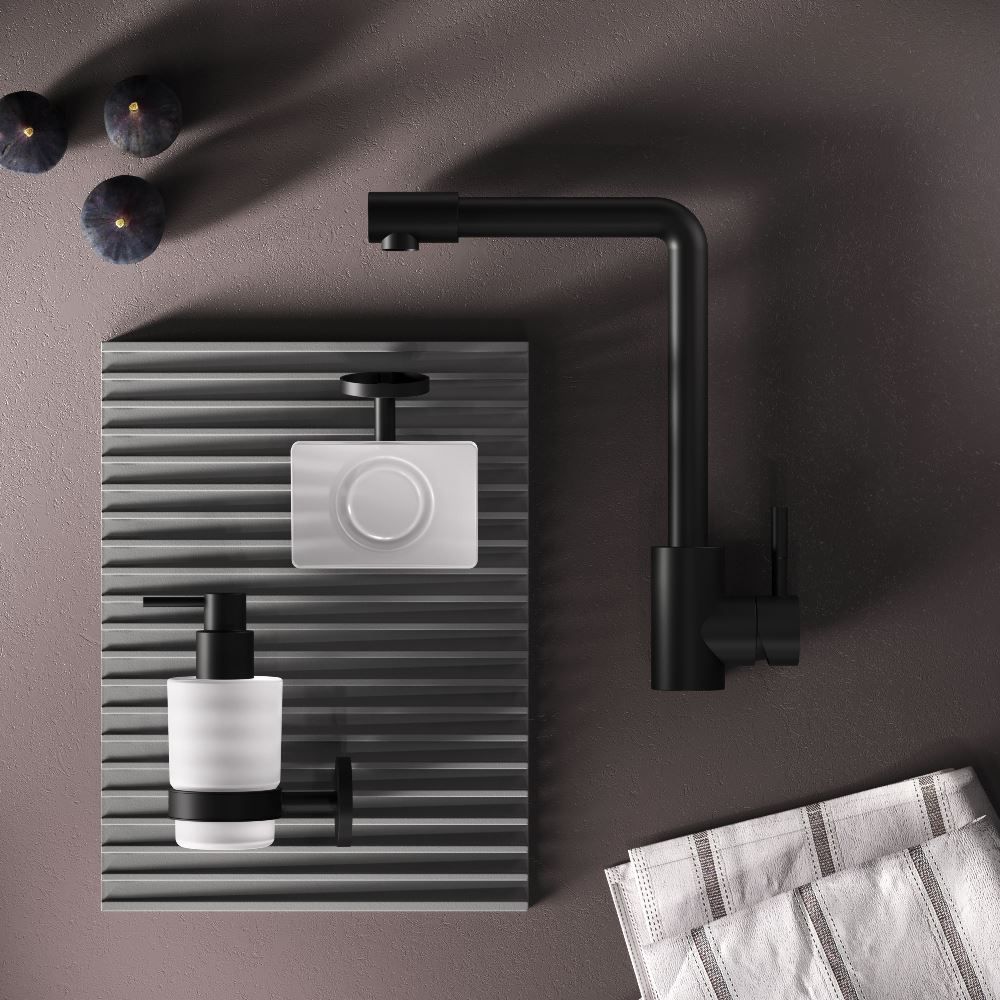 L-образная архитектура смесителя идеально подойдет для использования с мойкой любого размера и значительно упростит такие задачи, как наполнение больших емкостей. Черный матовый цвет сделает этот смеситель главным акцентом в любом интерьере.