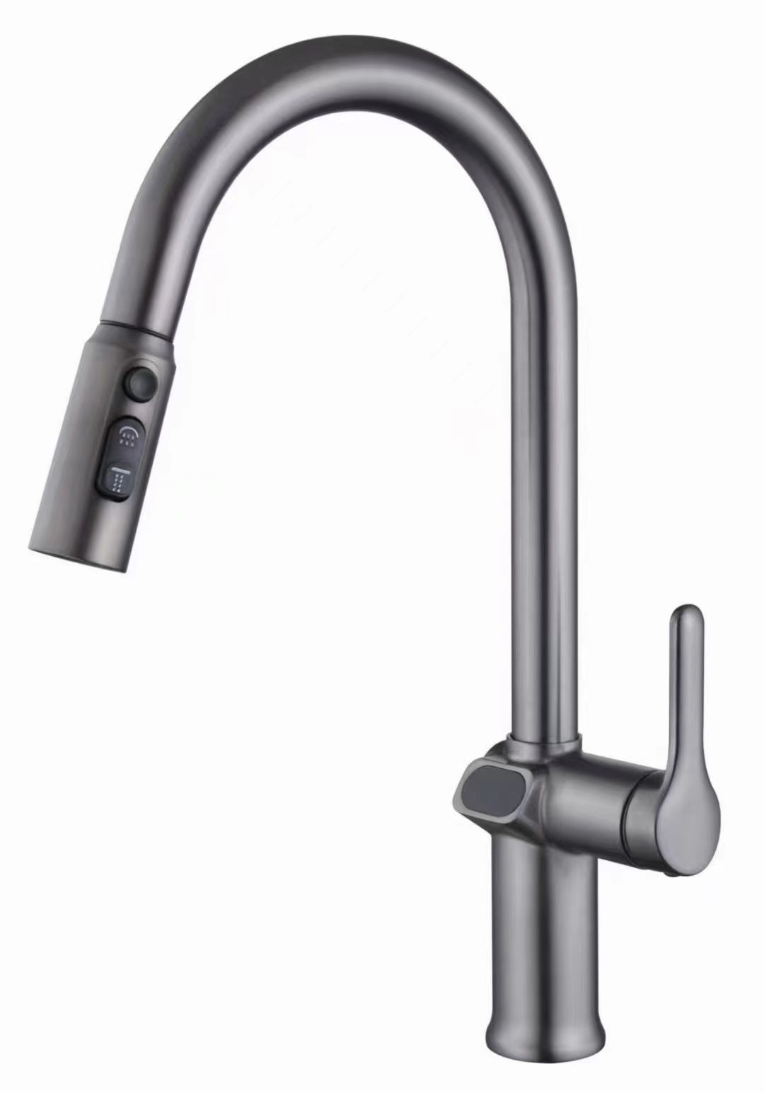 Смеситель K15GMLED (Gun Metal): Элегантный смеситель цвета графит с LED-дисплеем. Вытяжной излив длиной 23,5 см и 3 режима аэратора делают его незаменимым помощником на кухне. Прочный латунный корпус и надежное крепление гарантируют долгий срок службы. Идеальный выбор для тех, кто ценит комфорт и стиль.