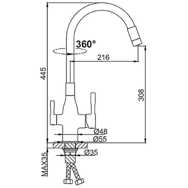 Излив: поворотный, гибкий, с каналом для питьевой воды.