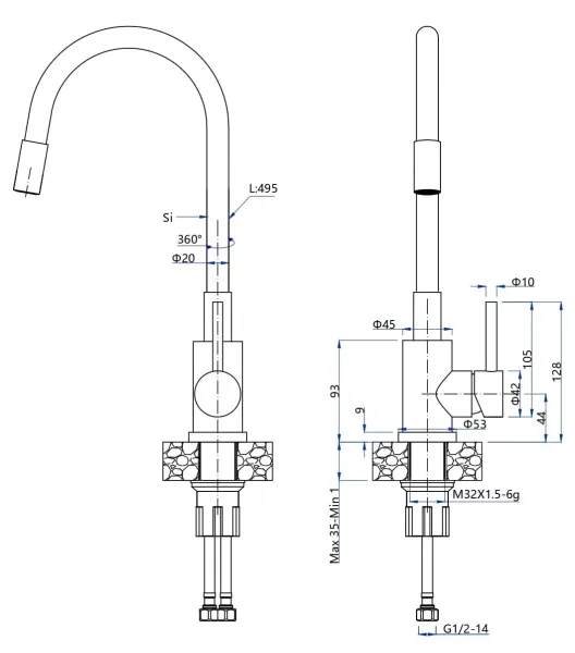 • Высота смесителя: