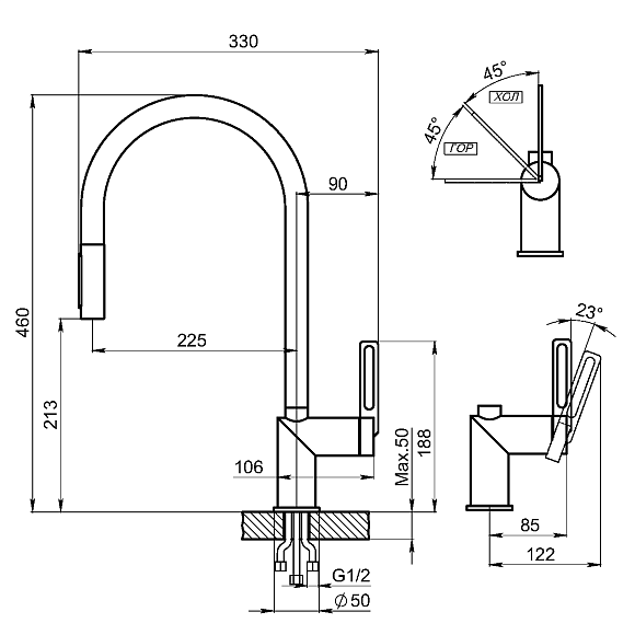 • Высота смесителя: