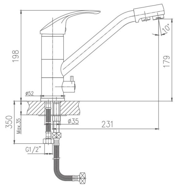 Смеситель для кухни бренда Haiba.Изготовлен из латуни.Картридж 40 мм.Укомплектован аэратором.Гибкая подводка 40 см.С поворотным изливом.Переключатель на фильтрованную воду расположен на корпусе смесителя.