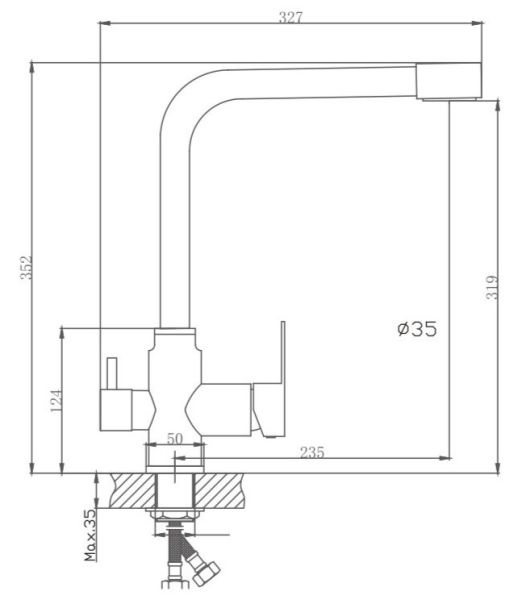 Смеситель для кухни бренда Haiba.Изготовлен из нержавеющей стали.Картридж 35 мм.Укомплектован аэратором.Гибкая подводка 40 см.С поворотным изливом.