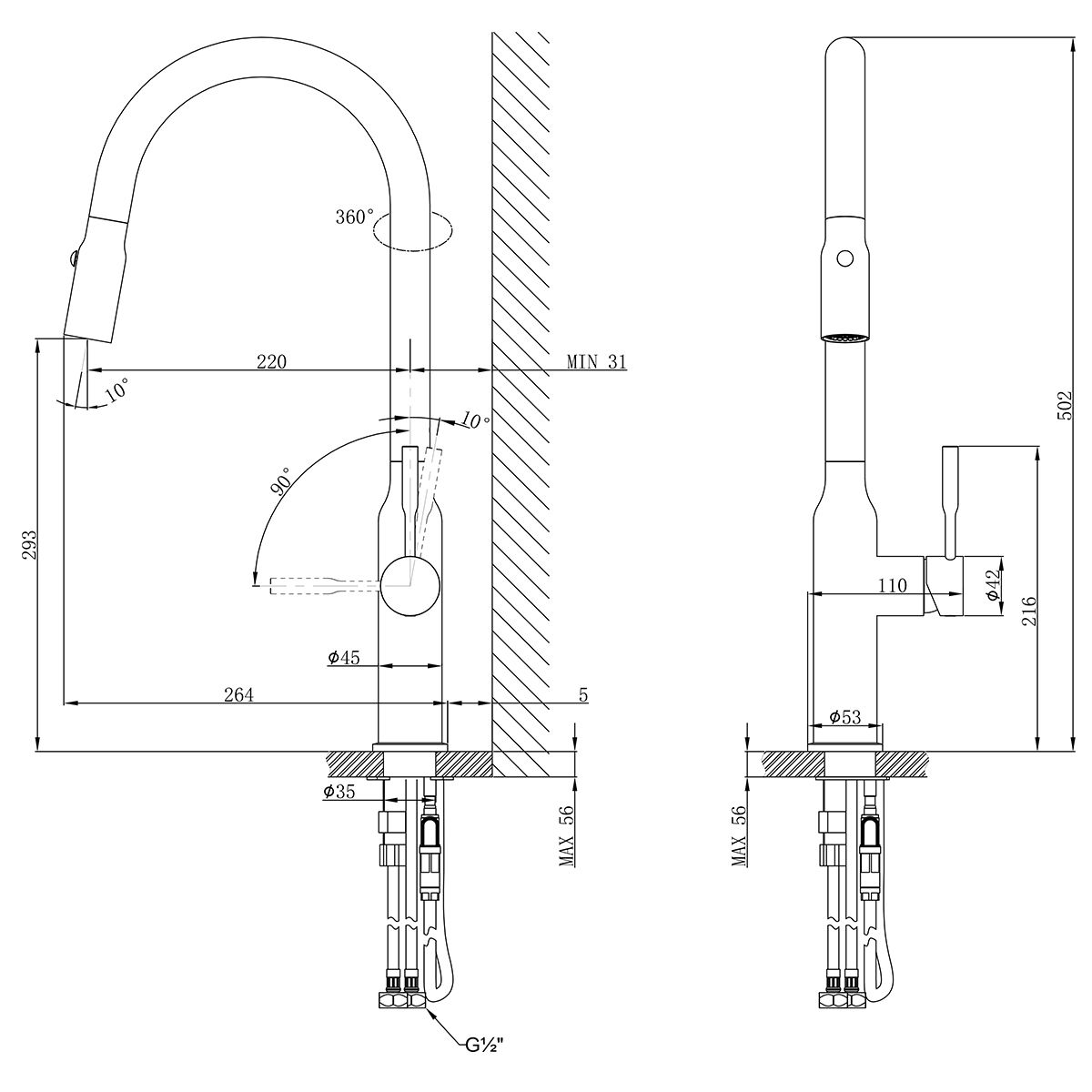 • Высота смесителя: