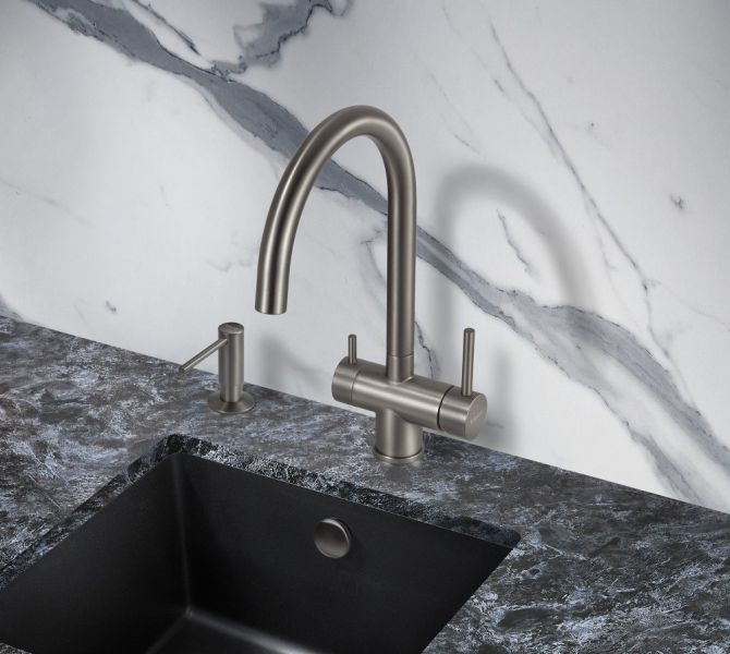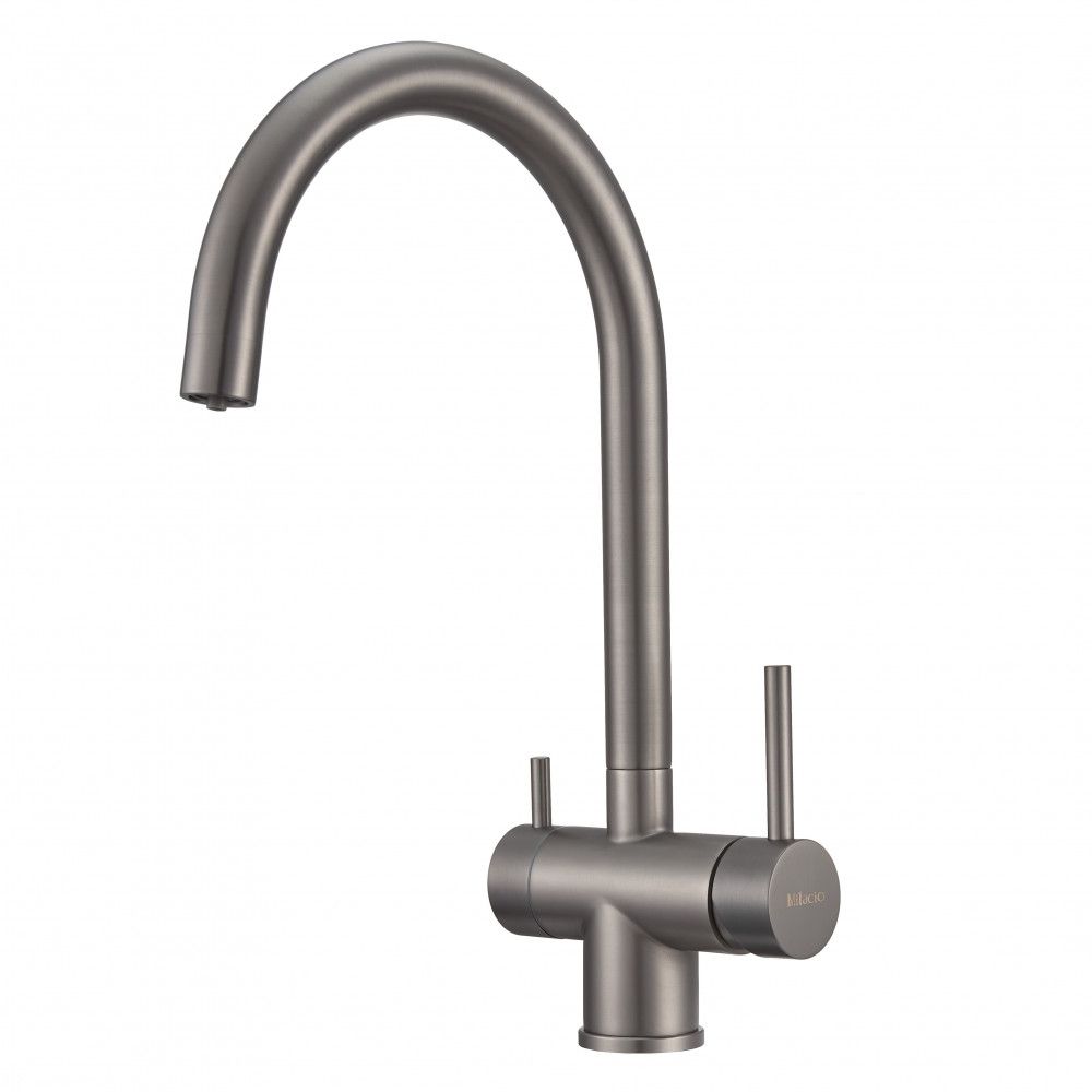 Смеситель для кухонной мойки Milacio Ultra (MCU.554.GM) из нержавеющей стали с PVD покрытием в цвете вороненая сталь, с возможностью подключения фильтра — стильное и высокофункциональное решение, которое выгодно подчеркнет все достоинства вашей кухни.