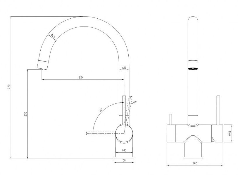 7. Ручка управления горячей и холодной водой имеет углы открытия 10° к стене и 90° от стены, что позволяет устанавливать смеситель максимально близко к стене.