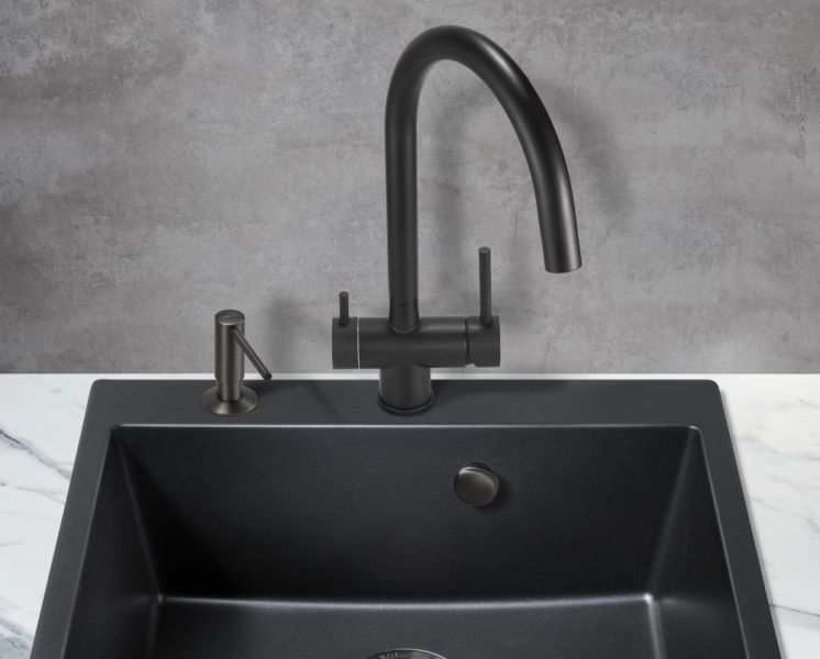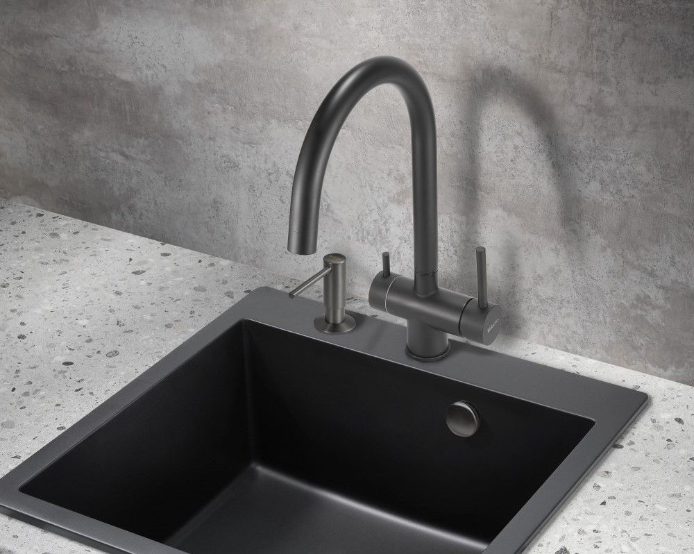 Модель выполнена в однородном чёрном цвете без вкраплений и деталей в других цветах и имеет изящный изогнутый кран, благодаря чему станет яркой, привлекающей внимание деталью на кухне и никого не оставит равнодушным.