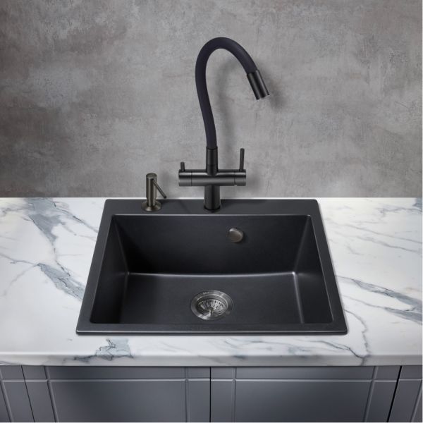 Модель выполнена в цвете Total Black ( черный ) и имеет изящный излив черного цвета, благодаря чему станет яркой, привлекающей внимание деталью на кухне и никого не оставит равнодушным.
