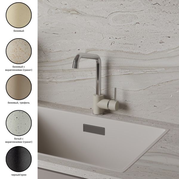 Все дело в цвете! Необычное решение для современной кухни – однорычажный смеситель коллекции COX с поворотным изливом и увеличенной высотой корпуса. Популярная форма смесителя в этот раз представлена в необычных цветах, что дает простор творчеству и позволяет сочетать его с мойками и кухонной мебелью разных фактур и материалов. А увеличенная высота корпуса дает больше возможностей при использовании.Разнообразие цветаБелый с вкраплениями (гранит), комбинация черного и хромого цветов в корпусе смесителя, и три варианта бежевого цвета: сахара, бежевый с вкраплениями (гранит) и нежный трюфель. Теперь точно получится попасть в цвет столешницы и/или цвет мойки либо создать контрастные сочетания. Все варианты покрытия, включая покрытие под камень, выполнены по специальной технологии, сохраняющей цвет и фактуру надолго и облегчающей уход за смесителем.Европейское качествоСделано в Италии. Гарантия – 5 лет.Технологии гарантируют долгий срок службыФабрика «Паини» использует только лучшие комплектующие. Аэратор Neoperl наполняет поток воды кислородом, увеличивает напор, экономя воду. Одно движение пальцем для очистки сеточки. Керамический картридж Nuovo Galatron – основа, необходимая для долгой работы смесителя.Легкая уборкаМыльная губка и сухая тряпочка – все, что нужно для уборки. Несколько движений – и готово.