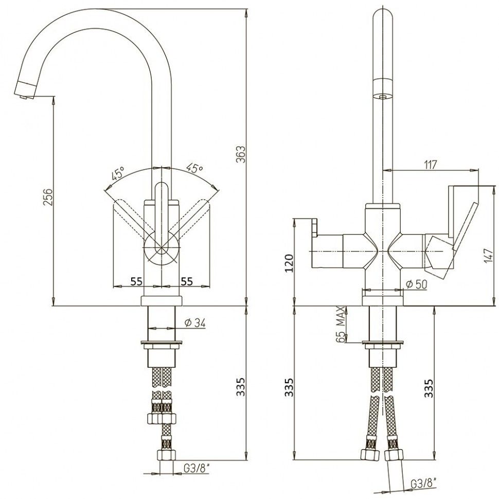 • Высокий корпус и поворотный излив дает больше возможностей при использовании на кухне.