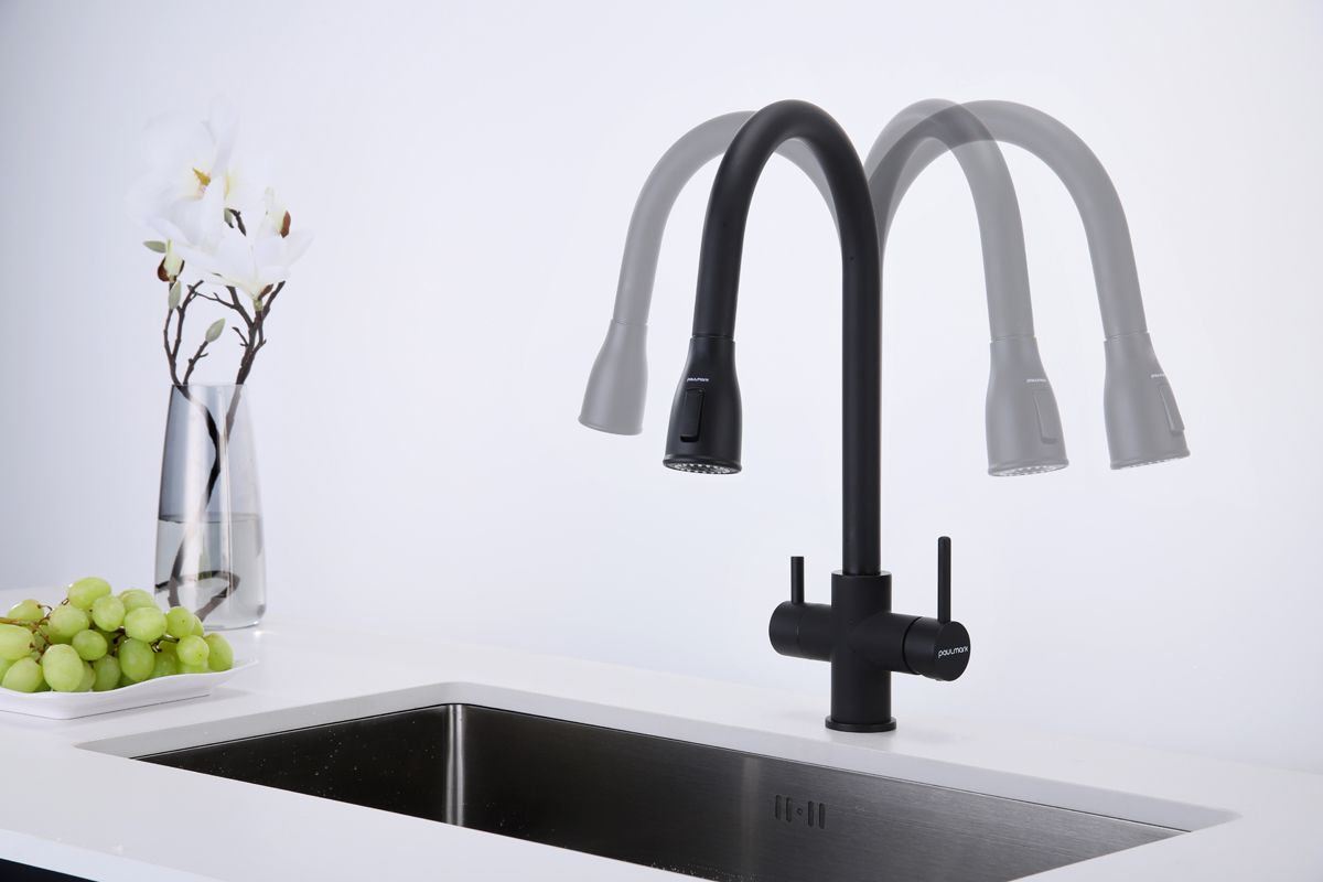 Конструкция смесителя с вытяжным шлангом значительно облегчает процесс мойки посуды или продуктов любого размера и формы.