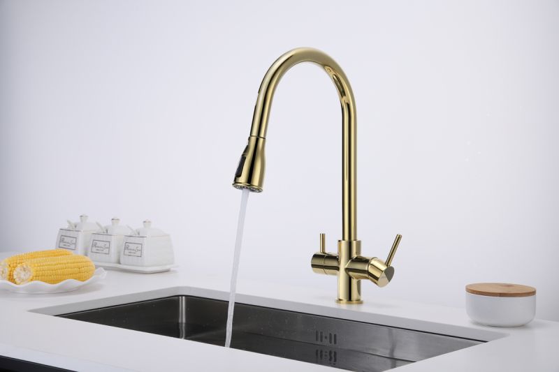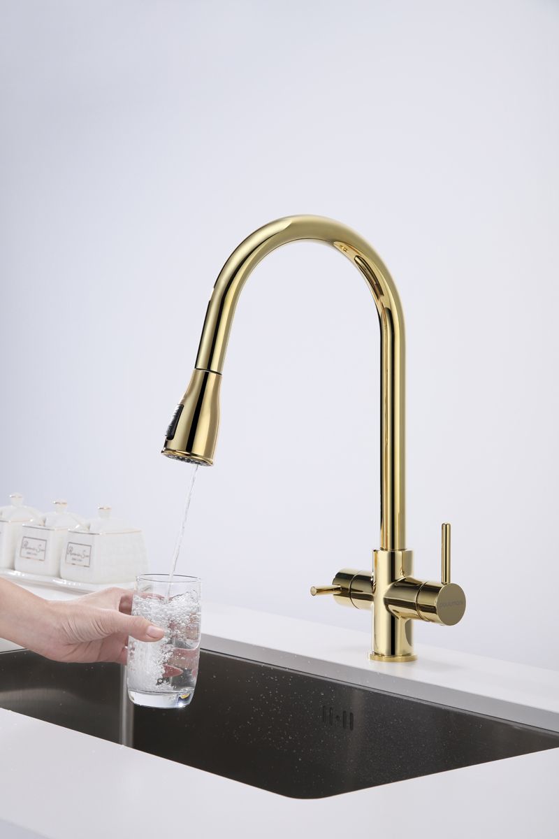 Смеситель под фильтрованную воду с выдвижным шлангом, артикул La214212-GИзготовлен из высококачественной латуни, которая отвечает высочайшим европейским стандартам качества, не содержит свинца, не разрушается со временем и безопасна для здоровья.Вытяжной шланг