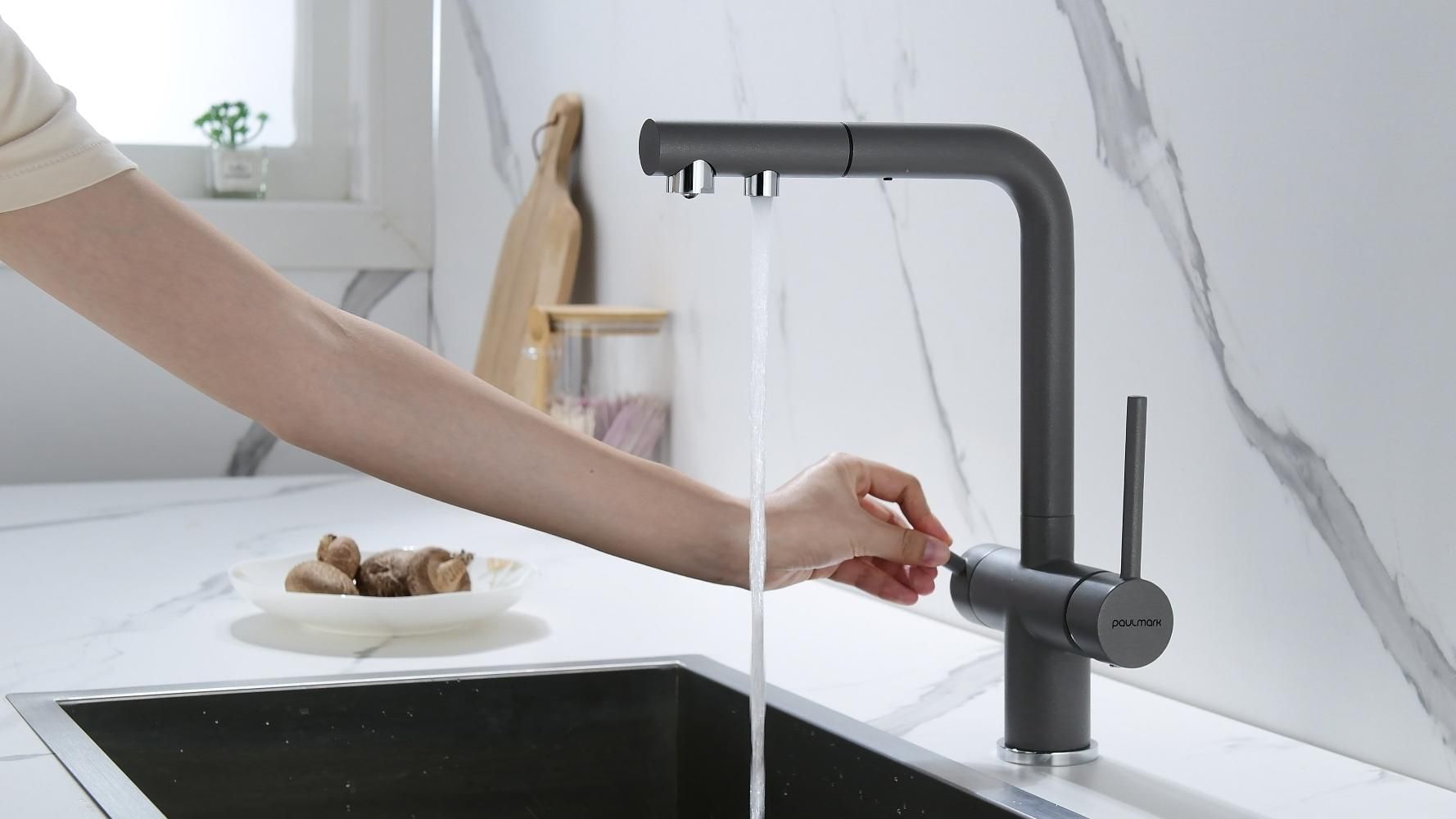 SERPENTINE оснащён функцией TRINKWASSER - излив смесителя имеет встроенный независимый канал для питьевой воды из фильтра, таким образом питьевая и водопроводная вода не смешиваются. Управление питьевой водой осуществляется отдельным рычагом, расположенным слева. Для пуска водопроводной воды используется большой рычаг справа.