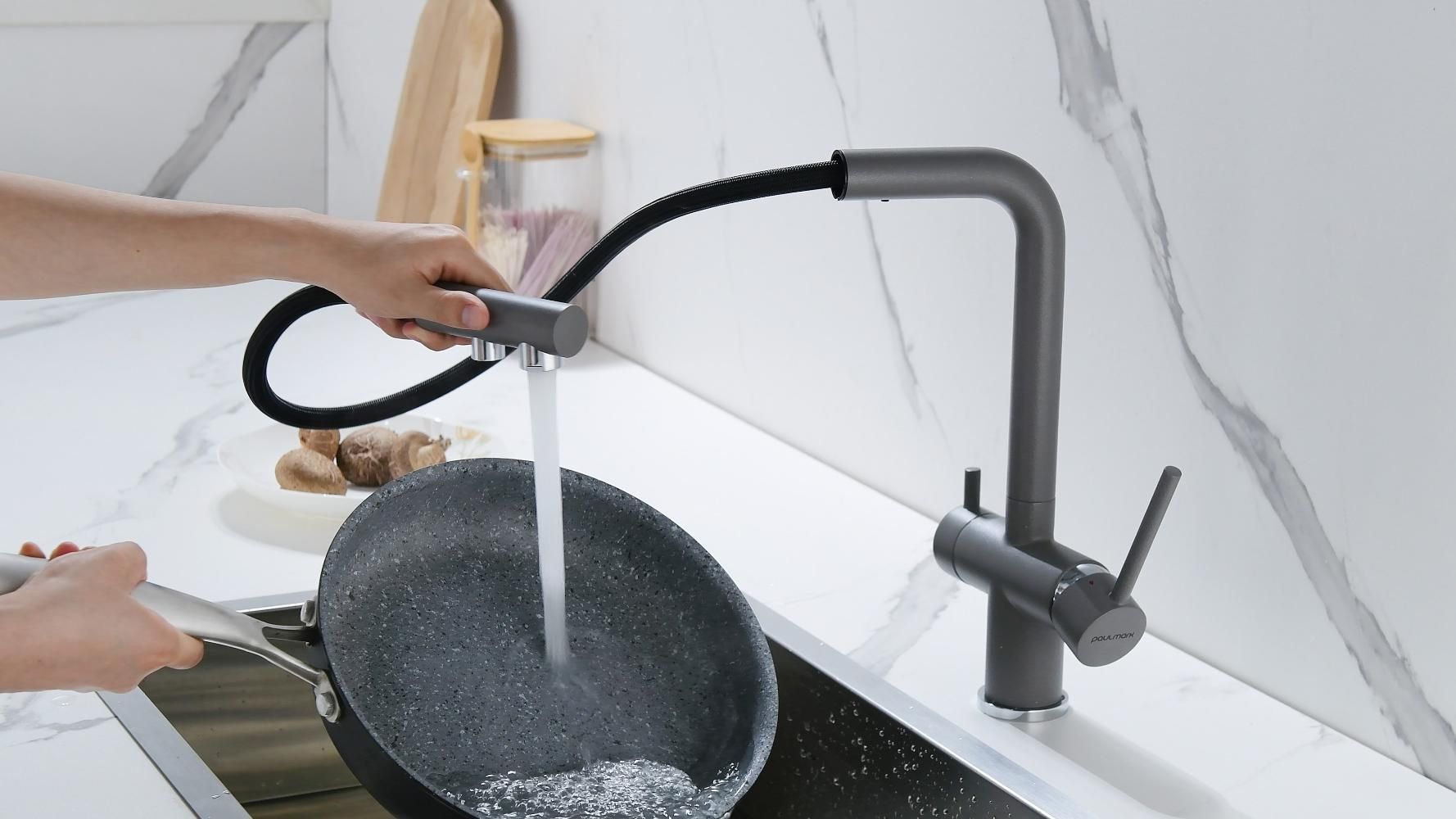 Смеситель оснащен гибким выдвижным изливом из нелойновой оплетки, которая обладает отличной устойчивостью к истиранию и разрушению. Данная техническая особенность расширяет рабочую зону смесителя, позволяя пользоваться им с удобством в больших мойках, мойках с двумя чашами, или наполнять водой ёмкость на столе рядом с мойкой, в том числе питьевой водой.