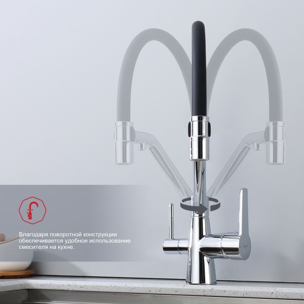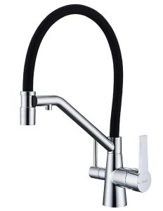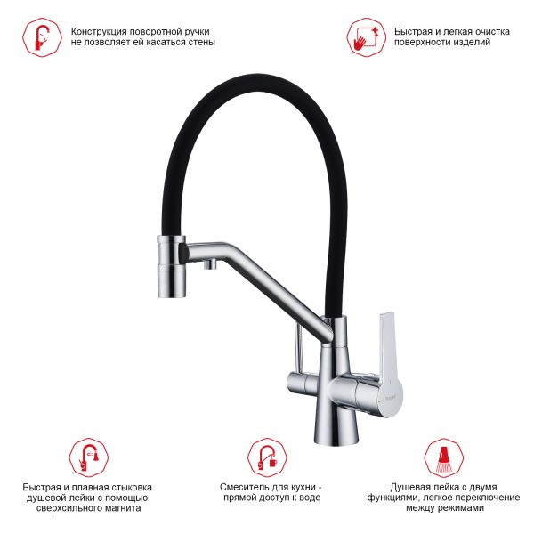 Смеситель для кухни со съемным изливом на магните и подключением фильтра питьевой воды. Гибкий съемный шланг значительно расширяет зону использования смесителя, благодаря этому можно мыть объемную посуду. Модель предназначена для одновременного подключения к водопроводу и фильтру и позволяет снабжать как обычной, так и питьевой водой.