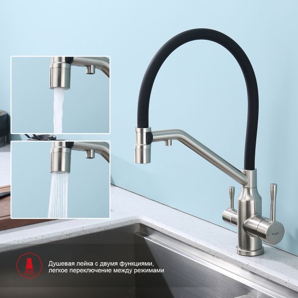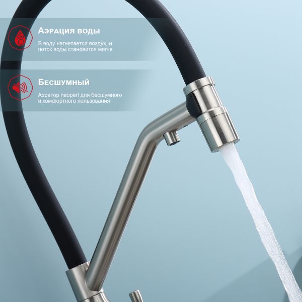Смеситель для кухни со съемным изливом на магните и подключением фильтра питьевой воды. Гибкий излив белого цвета. Крепление на усиленной гайке. Подводка длиной 55 см имеет латунные гайки.Гарантия на смеситель 7 лет и 2 года на покрытие!