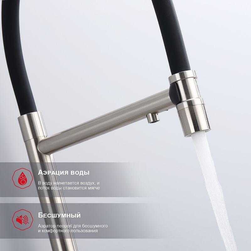 Смеситель для кухни со съемным изливом на магните и подключением фильтра питьевой воды, гибкий излив белого цвета. Крепление на усиленной гайке. Подводка длиной 55 см имеет латунные гайки. Гарантия на смеситель 7 лет и 2 года на покрытие!