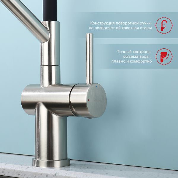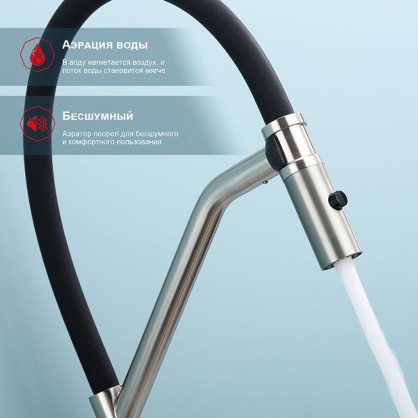 Смеситель для кухни со съемным изливом на магните. Кухонные смесители торговой марки RAGLO– это оригинальность и уют для каждого дома. Кран выполнен из высококачественных материалов, что гарантирует его долговечность и надежность. Эта сантехника отличается полезным функционалом, экологичными решениями, оригинальным стилем и легкостью монтажа. Поворотный излив позволяет с большим удобством пользоваться им на кухне. Оснащен гибкой системой подключения, что облегчает его монтаж и установку. Встроенный аэратор эффективно фильтрует примеси и уменьшает шум от импульсов воды. Гладкая внутренняя стенка обеспечивает мягкий поток воды. Подходит к кухонным мойкам практически любых размеров и форм. Кухонный смеситель является неотъемлемой частью любой кухни, и данный смеситель - отличный выбор для тех, кто ценит качество, надежность и комфорт.