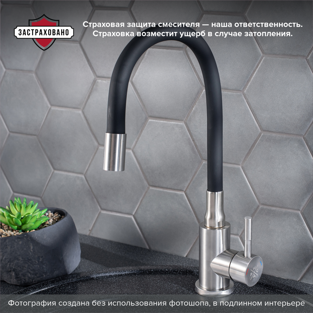 Одноручковый смеситель для кухни из нержавеющей стали с гибким изливом прост и удобен в использовании.