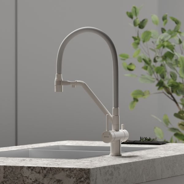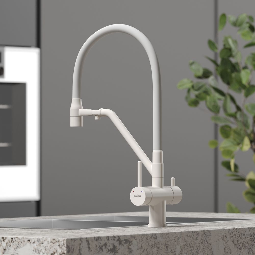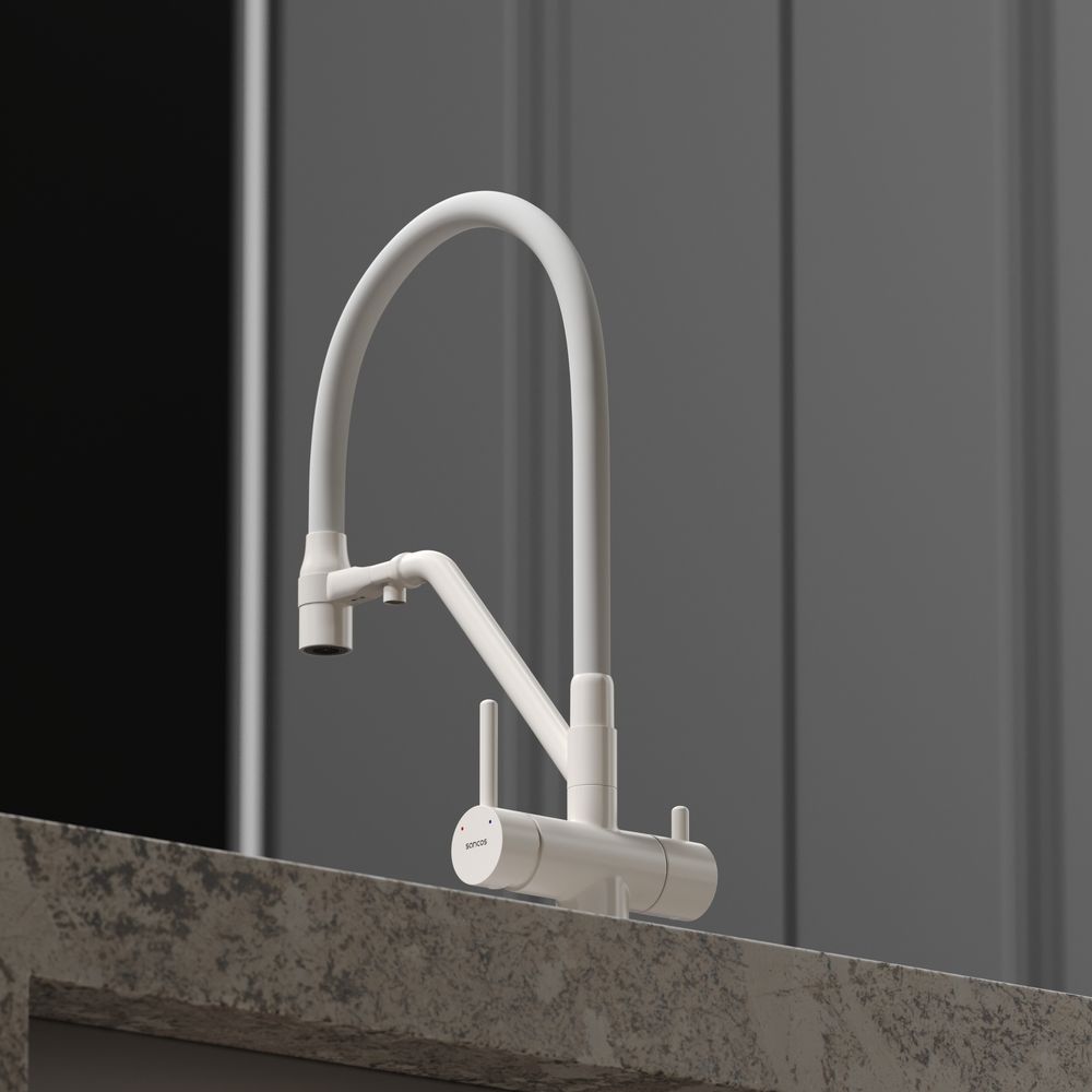 Смеситель для кухни SANCOS Dora с гибким изливом и возможностью подключения фильтра для воды, цвет матовый белый, арт. SC4003MWС возможностью регулировки температуры водыАэратор, гибкая подводка, ключ и крепления для монтажа