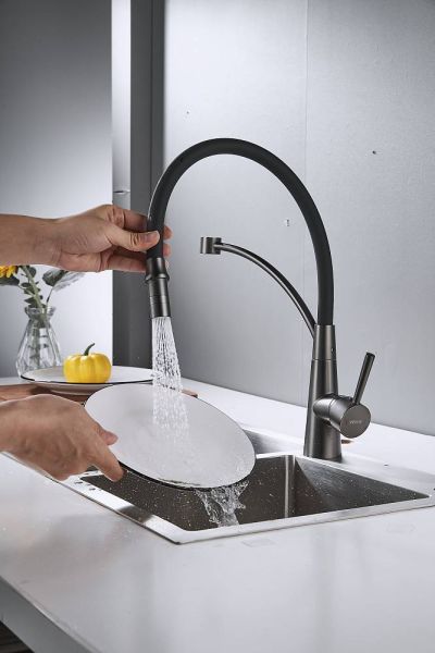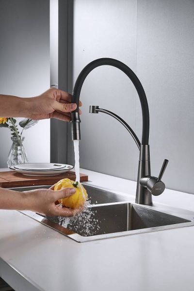 Смеситель для кухни с подключением фильтра Shevanik S743T-3, оружейная сталь/черный.Управление: рычажное.Вращение излива: да.Выдвижной излив: нет.Гибкий излив: да.Высота:44.