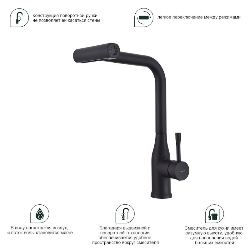 Смеситель оснащён выдвижным и поворотным изливом с режимом «душ», который позволяет выбирать между обычной струёй воды и мягкой душевой насадкой. Благодаря этому вы сможете легко и быстро настроить нужный режим в зависимости от ваших потребностей и предпочтений.