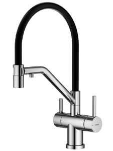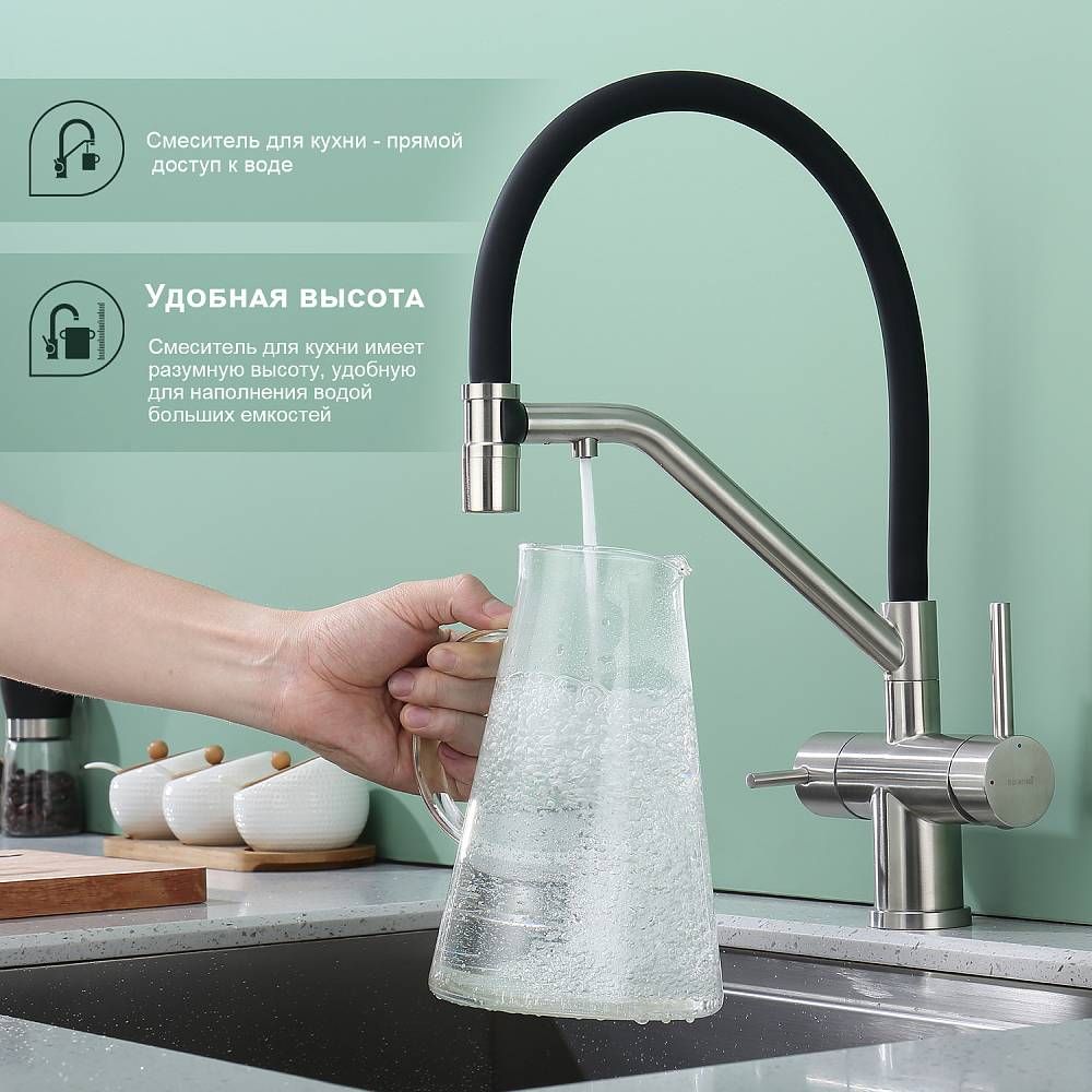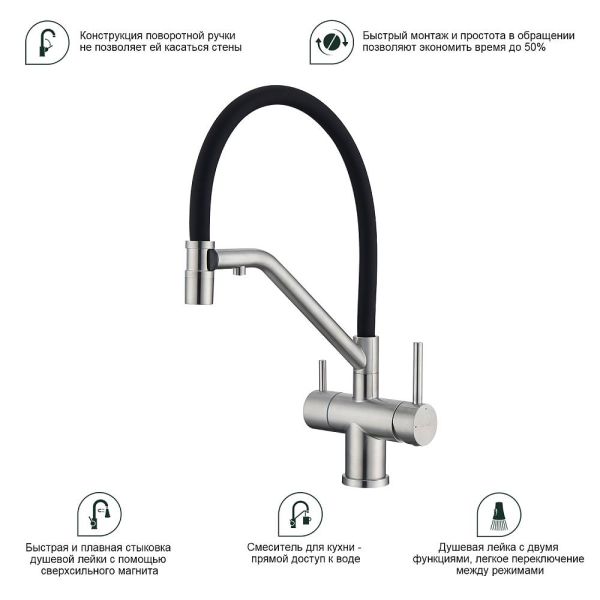 Splenka S70.62.05 Смеситель для кухни со съемным изливом на магните и подключением фильтра питьевой воды. Смесители для кухни с гибким изливом имеют необычный внешний вид и особую конструкцию. Нижняя часть представляет собой обычный однорукий латунный смеситель с регулировкой холодной и горячей воды, регулировкой напора и переключателем на фильтр с другой стороны. Верхняя часть это гибкий излив из пищевого силикона. С его помощью можно самостоятельно регулировать глубину выноса и высоту излива, что решает проблему при наполнении раковины посудой. Смеситель поворачивается на 360 градусов и оснащен отдельным выходом для фильтрованной воды. Переключение на воду из фильтра осуществляется переключателем с керамическим картриджем.