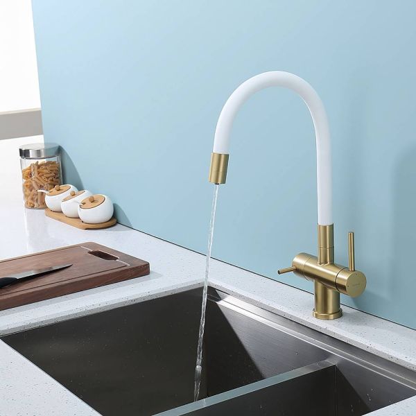 Смеситель для кухни с подключением к фильтру питьевой воды Splenka S70.64.03. Цвет: сатин золотой. Гибкая подводка 50 см идет в комплекте. Благодаря грамотно разработанной конструкции, прибор отлично справляется с регулированием температуры и напора потоков воды. Однорычажные смесители максимально удобны при эксплуатации, всего одним движением руки можно закрыть или открыть воду, имеют стильный внешний вид, а также комфортность в использовании. Гарантия 5 лет.