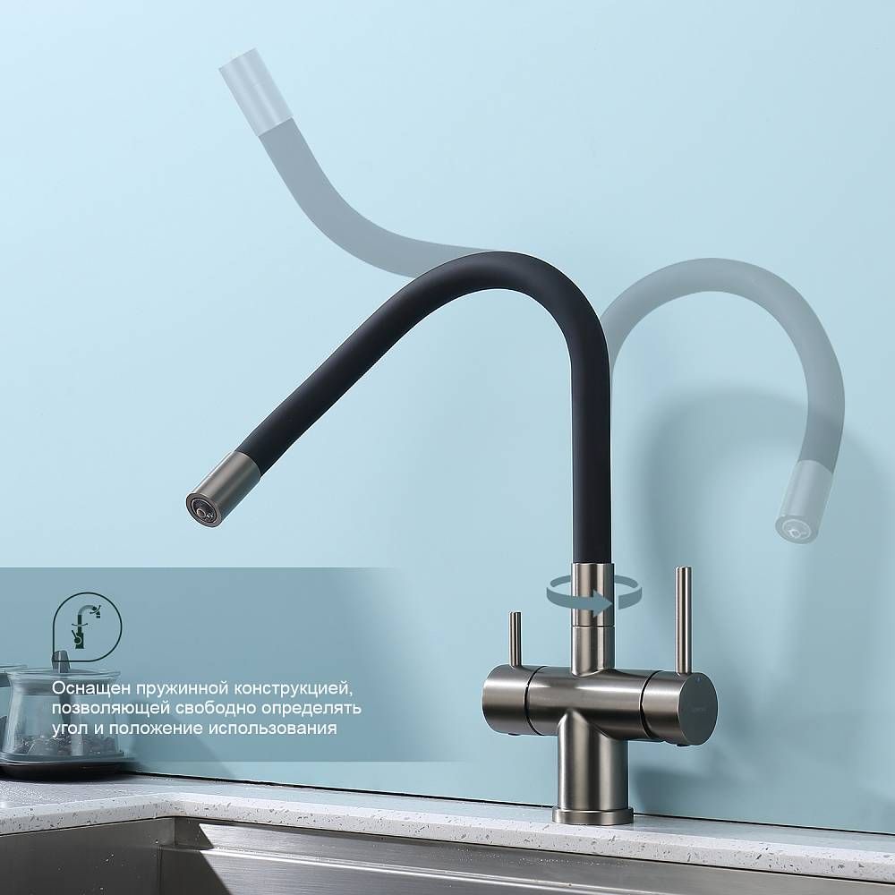 Смеситель для кухни с подключением к фильтру питьевой воды Splenka S70.64.09. Цвет: графит. Гибкая подводка 50 см идет в комплекте. Благодаря грамотно разработанной конструкции, прибор отлично справляется с регулированием температуры и напора потоков воды. Однорычажные смесители максимально удобны при эксплуатации, всего одним движением руки можно закрыть или открыть воду, имеют стильный внешний вид, а также комфортность в использовании. Гарантия 5 лет.