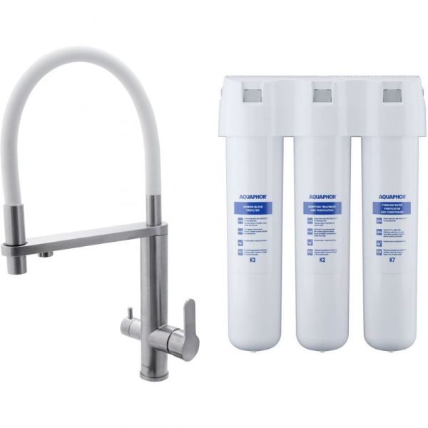 Смеситель для кухни Swedbe Selene Plus 8441K в комплекте с фильтром Аквафор Кристалл нержавеющая сталь/белый
