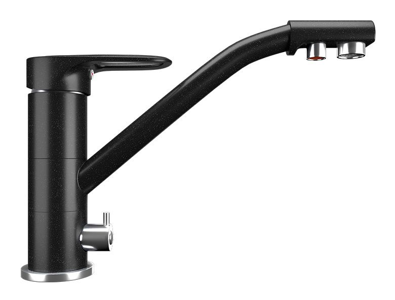 Высокоэргономичный кухонный смеситель с дополнительным краном для подключения фильтрованной воды, оснащенный кран-буксой с керамическими пластинами. Реализован тройной подвод воды через один излив: холодная, горячая и фильтрованная. Переход с одного подвода на другой производится поворотом рычага. Набор для соединения с фильтром входит в комплект. Система фильтрации приобретается дополнительно и монтируется под мойку, специальный индикатор сообщает о необходимости замены картриджа. Материал корпуса выполнен из высококачественной латуни, а окрашивание под искусственный камень в цвет мойки ULGRAN выполняется на собственном производстве, что позволяет идеально попасть в фирменный цвет ULGRAN. В качестве керамического картриджа используется известный бренд Wanhai диаметром 35 мм с высокой пропускной способностью в 500 тысяч циклов открывания-закрывания. На подвижные части картриджа Wanhai нанесена специальная невымываемая силиконовая смазка, а керамические пластины изготовлены из 96 процентов оксида алюминия, что, в сочетании с высоким качеством шлифовки обеспечивает долговечность, надежность, плавность хода рукоятки. Смеситель оборудован съемным пластиковым аэратором для экономии воды и поворотным изливом на 360 градусов. В комплектацию входят: керамический картридж Wanhai, гибкая подводка, комплект крепежных элементов, кран-букса с керамическими пластинами для дополнительного излива для фильтрованной воды, набор для подсоединения фильтра питьевой воды (гибкая подводка + переходник-цанга), технический паспорт и гарантийный талон.Заводская